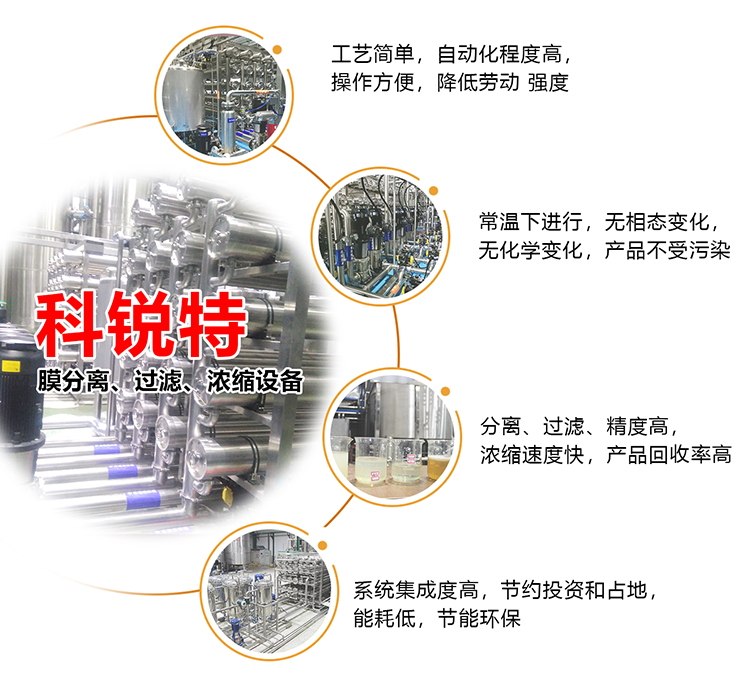 5)、完全根據(jù)用戶需求,確定較高系統(tǒng)回收率和系統(tǒng)脫鹽率,從而獲得高濃縮倍數(shù)或高純度的物料;