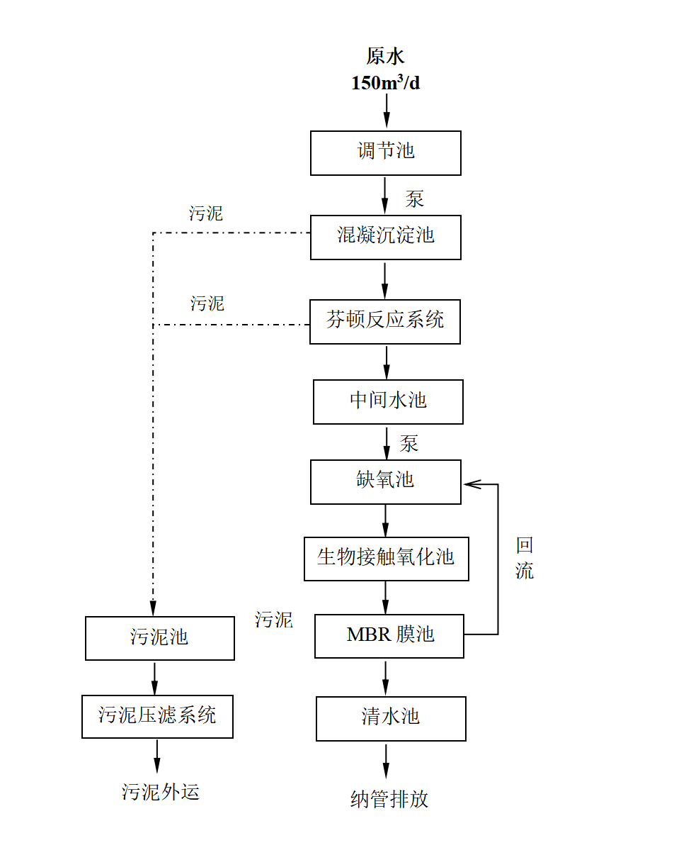 具體流程說明:垃圾滲濾液經(jīng)過調(diào)節(jié)池調(diào)節(jié)水質(zhì)水量后,通過泵提升至混凝反應(yīng)池,投加PAC、PAM,在攪拌的作用下,藥劑與泥水混合物進(jìn)行充分混合反應(yīng)形成大塊絮狀懸浮物;混凝反應(yīng)池出水自流入斜管沉淀池進(jìn)行沉淀從而去除水中的雜質(zhì)、重金屬等,上清液自流進(jìn)入芬頓氧化系統(tǒng),先通過投加硫酸將pH調(diào)至4~6、同時(shí)投加FeSO4,在空氣的攪拌下與泥水混合物充分混合反應(yīng),再投加足量雙氧水,在空氣攪拌作用下實(shí)現(xiàn)藥劑與泥水混合物的充分混合,促進(jìn)芬頓反應(yīng)的充分進(jìn)行,芬頓反應(yīng)將大部分有機(jī)物分解為無機(jī)物,并促進(jìn)水體中COD的降解,芬頓反應(yīng)的出水自流入沉淀區(qū),通過回調(diào)pH值,廢水中形成絮體,沉淀去除,運(yùn)行一段時(shí)間進(jìn)行排泥處理。出水自流入中間水池,通過泵提升至缺氧池,投加碳源,去除大部分的總氮后自流入生物接觸氧化池,通過曝氣去除大部分的氨氮及有機(jī)物,出水進(jìn)入MBR膜池,泥水分離后出水納管排放。