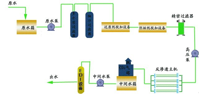 原水→原水加壓泵→多介質(zhì)過(guò)濾器→活性炭過(guò)濾器→軟水器→精密過(guò)濾器→一級(jí)反滲透機(jī)→中間水箱→中間水泵→EDI系統(tǒng)→微孔過(guò)濾器→用水點(diǎn)