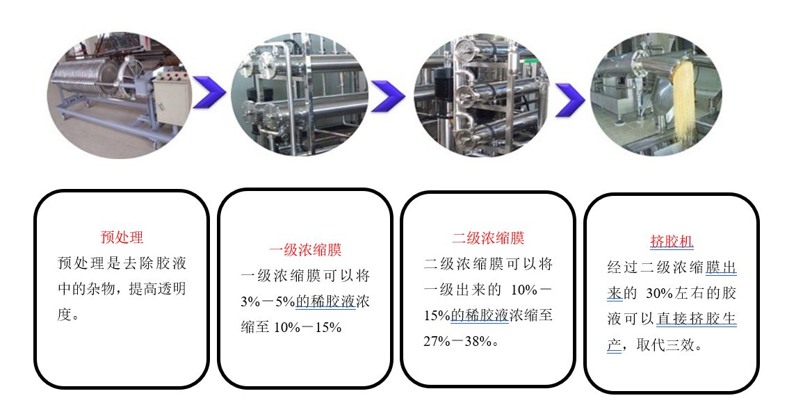 科銳特利用特種膜分離技術(shù),部分替代傳統(tǒng)的熱濃縮技術(shù),將稀膠液中的水、小分子多肽以及部分金屬鹽類去除,從而達(dá)到分離,純化和濃縮的效果。整個(gè)過(guò)程濃縮成本遠(yuǎn)遠(yuǎn)小于傳統(tǒng)蒸汽濃縮設(shè)備,節(jié)能效果明顯,并且操作簡(jiǎn)便,設(shè)備易于維修保養(yǎng)。全自動(dòng)一級(jí)二級(jí)一體式衛(wèi)生級(jí)濃縮膜設(shè)備,將3%左右的稀膠液快速提升到12~15%再經(jīng)過(guò)二級(jí)膜提至25%-32%,直接擠膠生產(chǎn)。設(shè)備操作簡(jiǎn)單、自動(dòng)化程度高、噪音小、現(xiàn)場(chǎng)衛(wèi)生好。一級(jí)膜蒸發(fā)一噸水只需要3-4度電,二級(jí)膜蒸發(fā)一噸水只需要5-6度電。無(wú)需其他能耗。